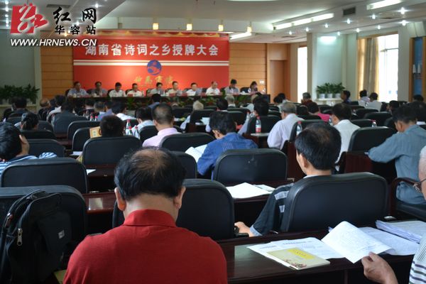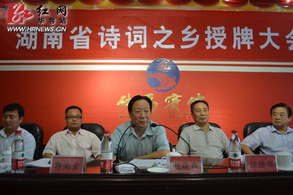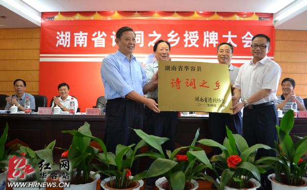 “章台喜捧诗乡匾,古邑齐吟李杜篇。”8月22日,在热烈的掌声中,华容县委副书记蒋南贵、县诗词协会会长刘禹志从湖南省诗词协会会长赵焱森、岳阳市诗词协会会长汪德辉手中接过湖南省“诗词之乡”牌匾。县人大常委会主任胡光前、副县长向阳出席授牌大会。会议由县委常委、宣传部长、统战部长毕金林主持。
