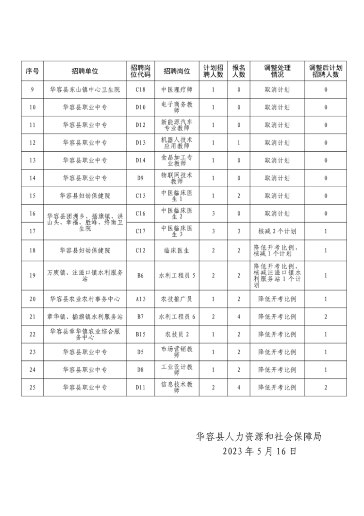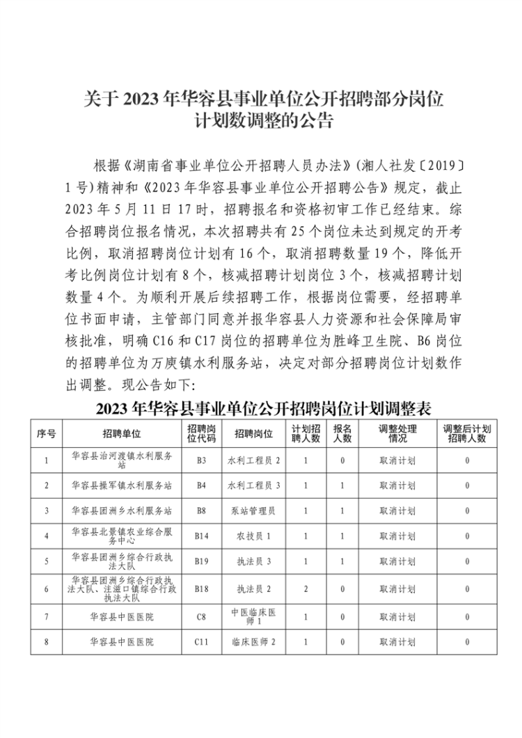关于2023年华容县事业单位公开招聘部分岗位计划数调整的公告
