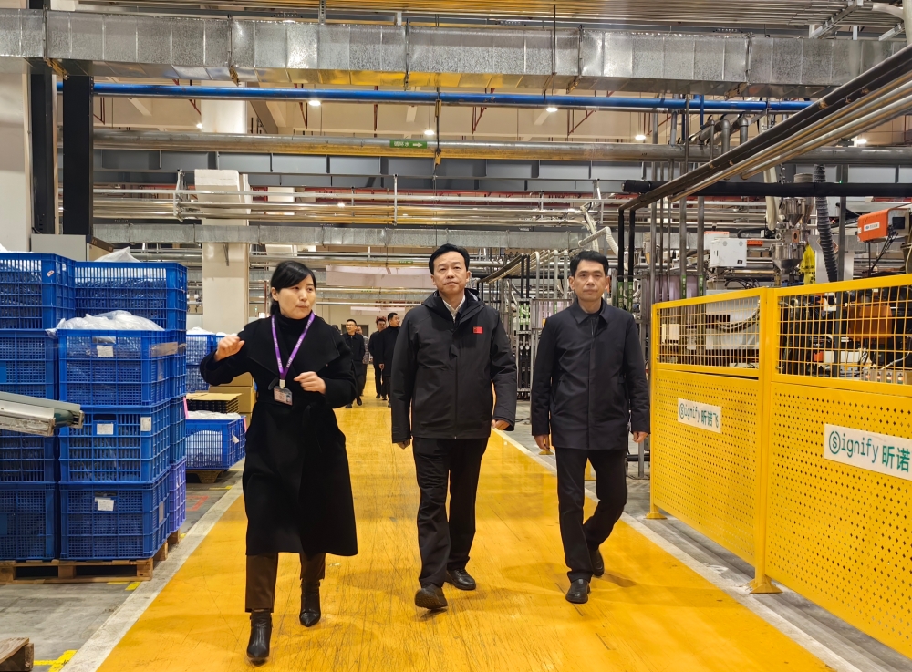 考察团来到江西省博林照明科技有限公司进行实地调研。在企业董事长蒋建峰的陪同下,周鹏一行深入企业展厅与生产一线,详细了解公司业务布局、核心技术优势、产品矩阵及市场应用前景,并就灯具行业的整体发展趋势进行了交流。