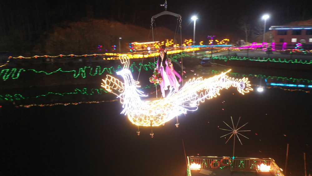 本届花灯会突出“游园互动”,游客可与古装NPC互动完成任务,获取“禹山银票”兑换礼品或参与特色拍卖。随着篝火点燃,游客围炉共舞,民俗小调与互动游戏轮番上演。高空特技节目“飞天凤凰”翩跹起舞,羽翼流光与地上灯海交相辉映,将现场气氛推向高潮。