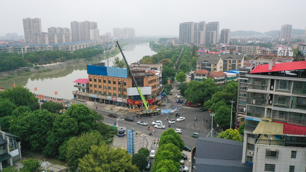 拆除现场,执法人员全程值守,并设置了安全警戒区域,同时疏导行人和车辆,确保拆除作业安全进行。专业施工人员利用吊车、气割机等设备,对存在隐患的广告牌进行了逐一分解拆除。历时9小时,黄湖楼楼顶5块广告牌被全部拆除。