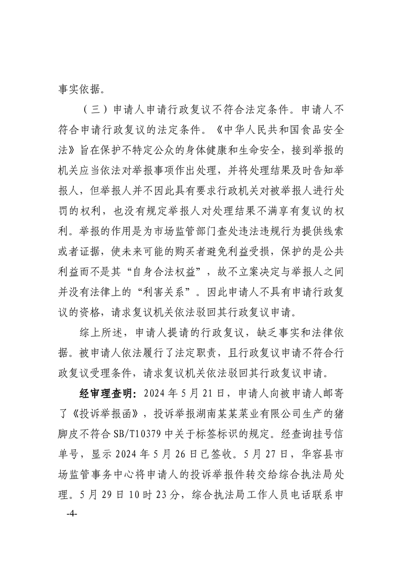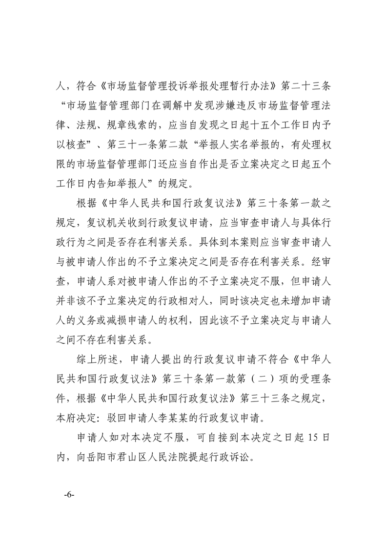华府复决字〔2024〕30号申请人李某某不服被申请人华容县市场监督管理局对其举报作出的不予立案决定一案行政复议决定书