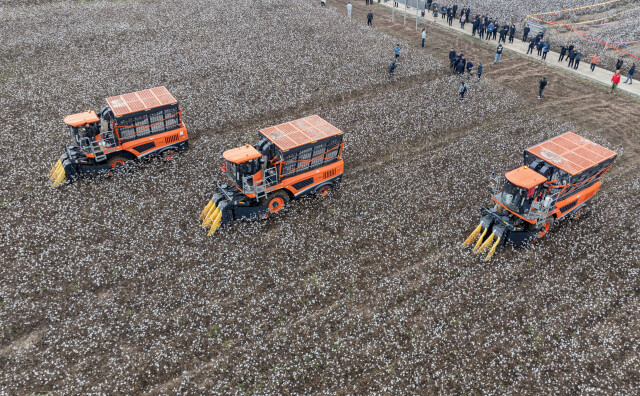 在团洲垸机采棉示范基地,与会人员现场观摩了机采棉品种展示与采收作业。该示范区总面积2000余亩,籽棉单产达 287.6 公斤,较全县平均水平提高 37.6 公斤,亩均产值1700元,实现亩均增收 240 元。现场3台采棉机轰鸣作业,仅用数分钟就完成1亩棉田的采收,生动展现了棉花生产迈向机械化的高效图景。据了解,采棉机1小时可采收12亩棉花,效率是人工的几十倍,大幅降低了采收成本,有效激发了棉农的种植积极性,对稳定全省棉花种植面积具有重要作用。