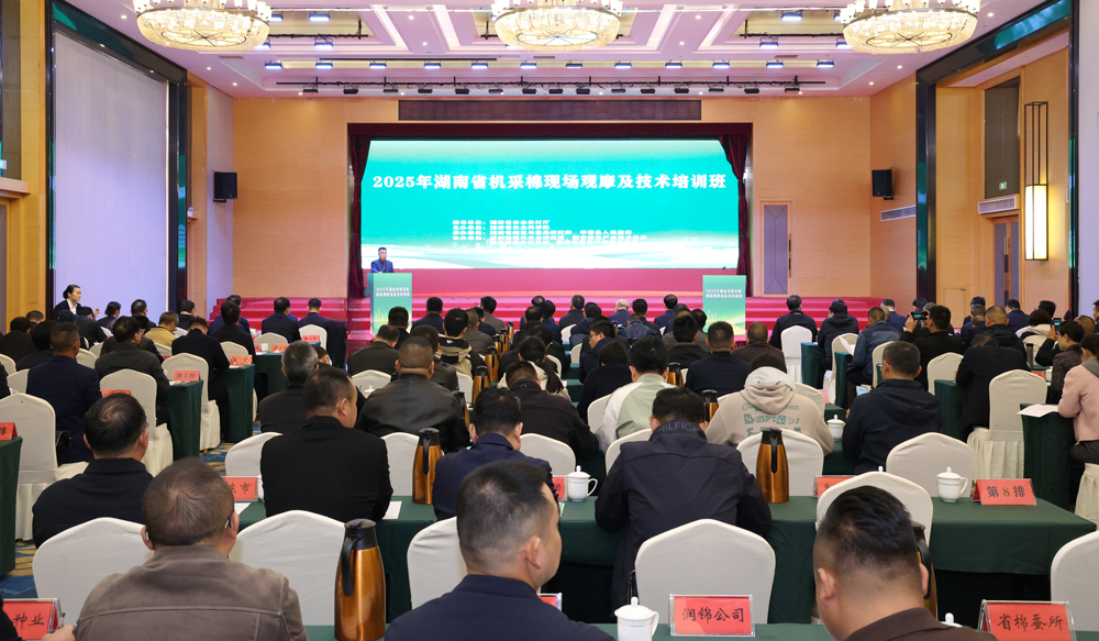 在技术培训大会上,陶伟军首先为活动致辞。随后,樊卫围绕“机器助人、链条升级、科技赋能”三大方向,详细阐述了推动棉花产业高质量发展的具体路径。陈常兵与李付广分别从国家政策与产业发展视角,深入解读了农业机械化对现代化建设的重要性,并剖析了全国棉花产业面临的机遇与挑战。刘启华系统阐述了机械化在农业农村现代化与产业振兴中的关键作用,明确了湖南下一阶段棉花全程机械化的发展思路与重点任务。会议还邀请湖南省棉花与蚕桑研究所所长肖才升进行专题授课。