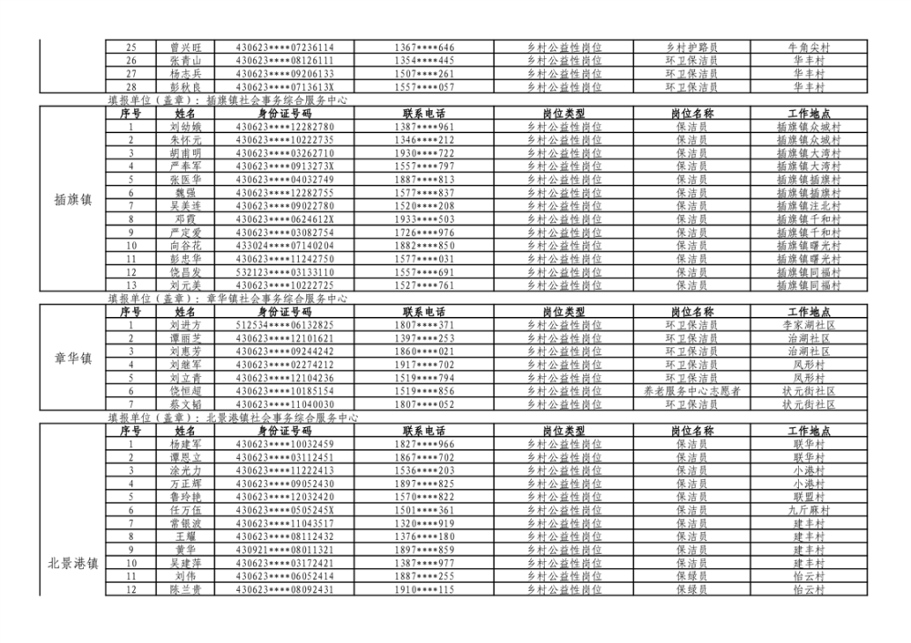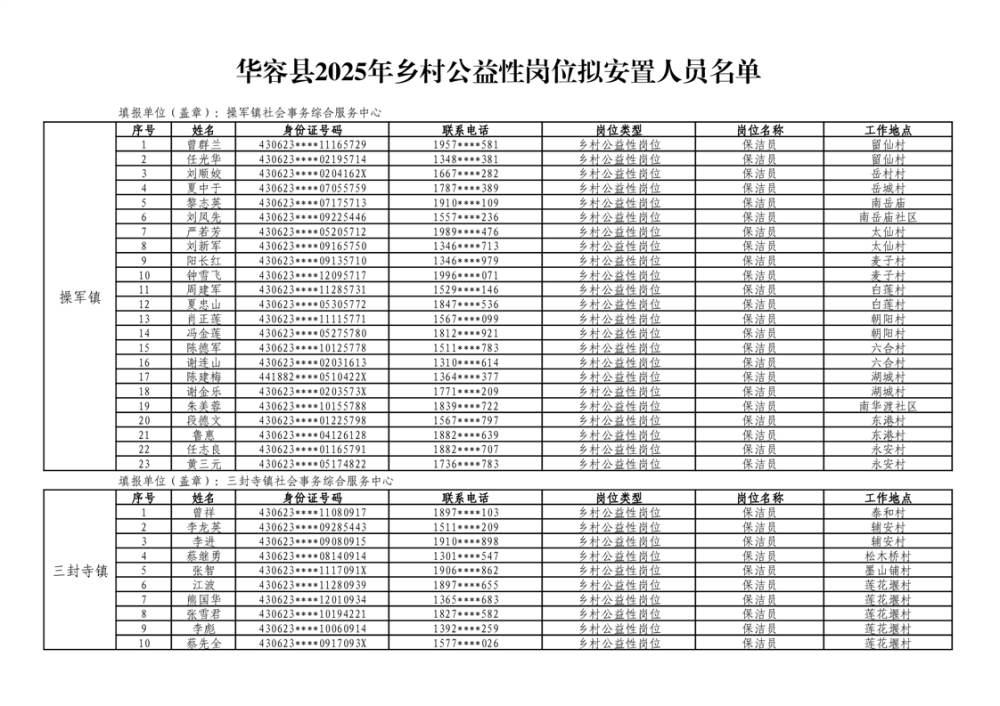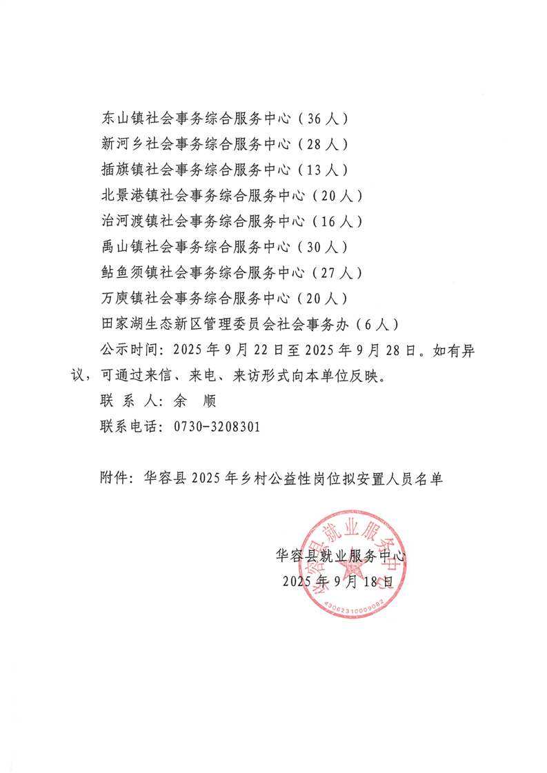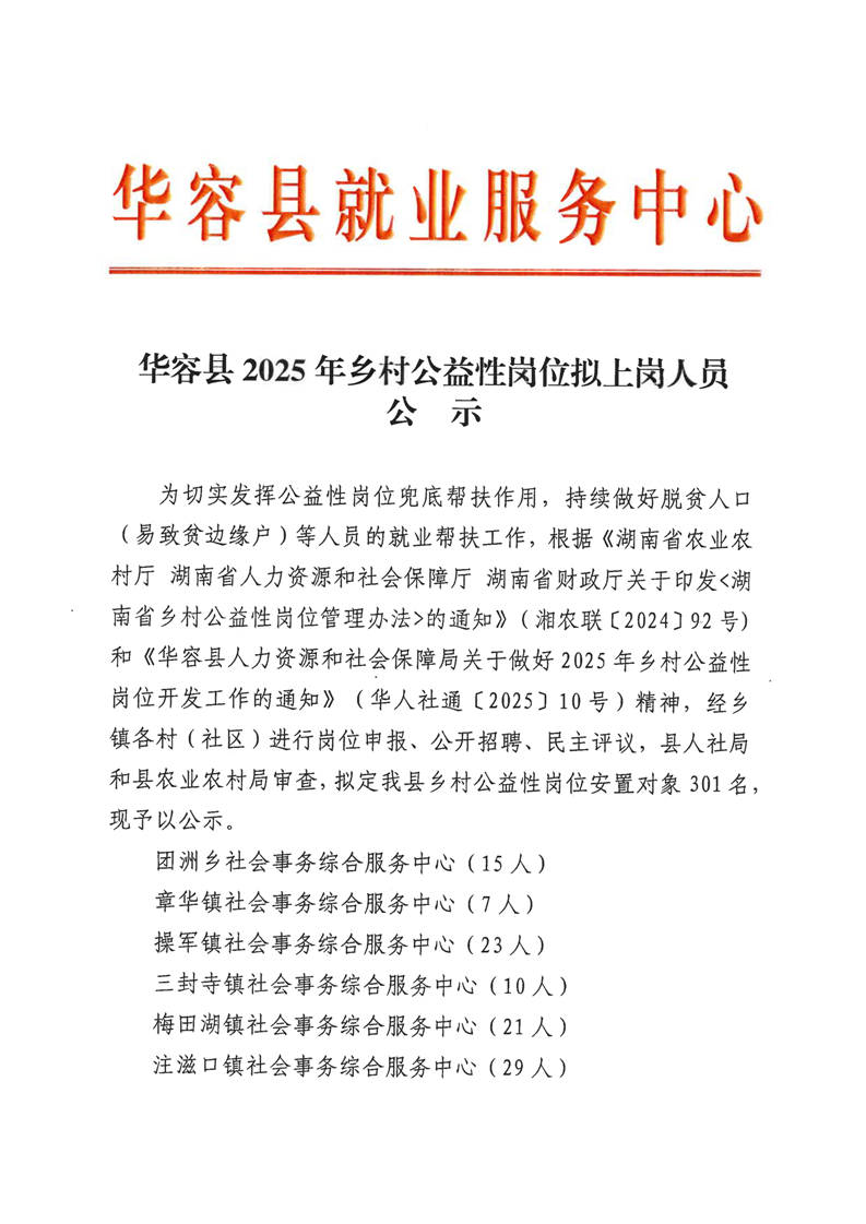 华容县2025年乡村公益性岗位拟上岗人员公示