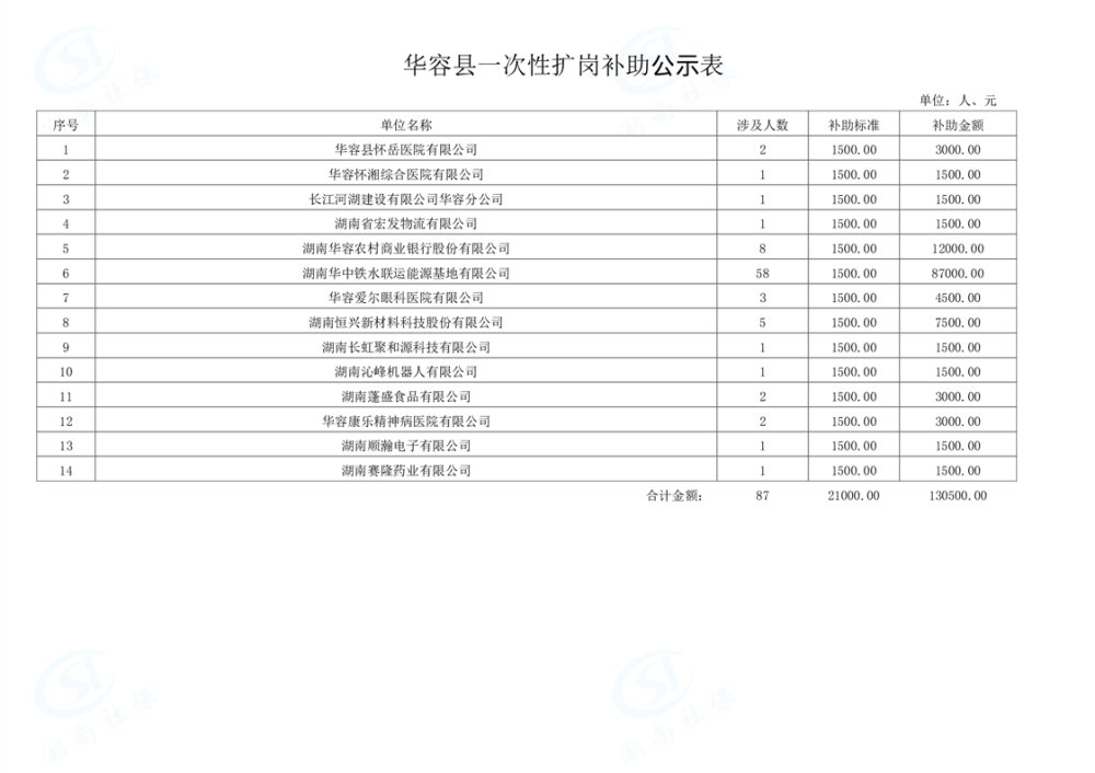 华容县一次性扩岗补助公示表