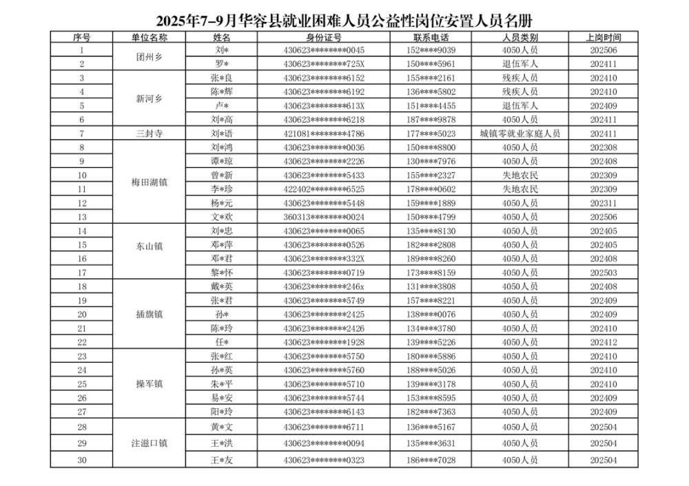 关于华容县2025年7-9月就业困难人员公益性岗位补贴的公示