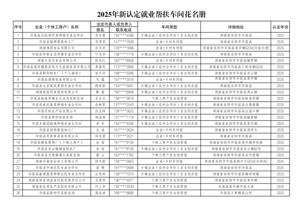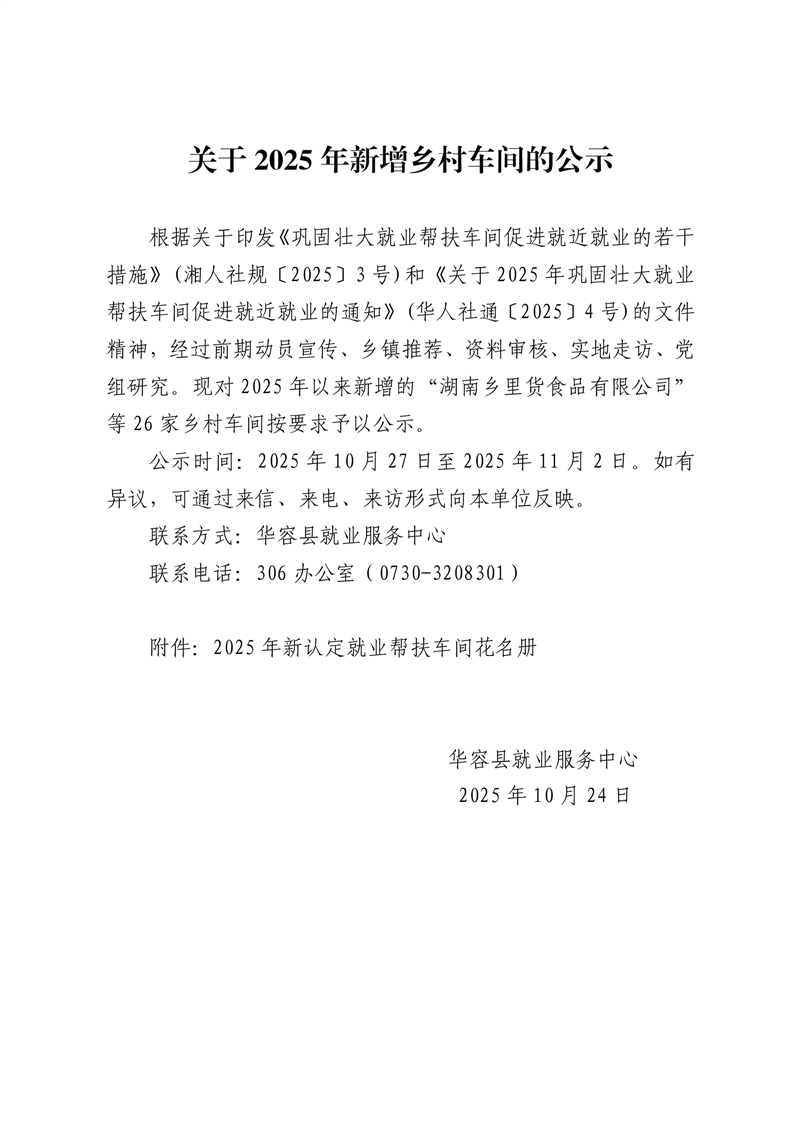 关于2025年新增乡村车间的公示