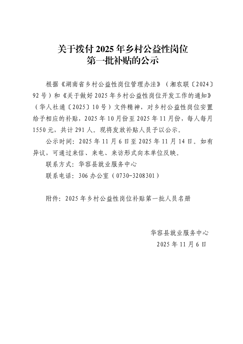 关于拨付2025年乡村公益性岗位第一批补贴的公示