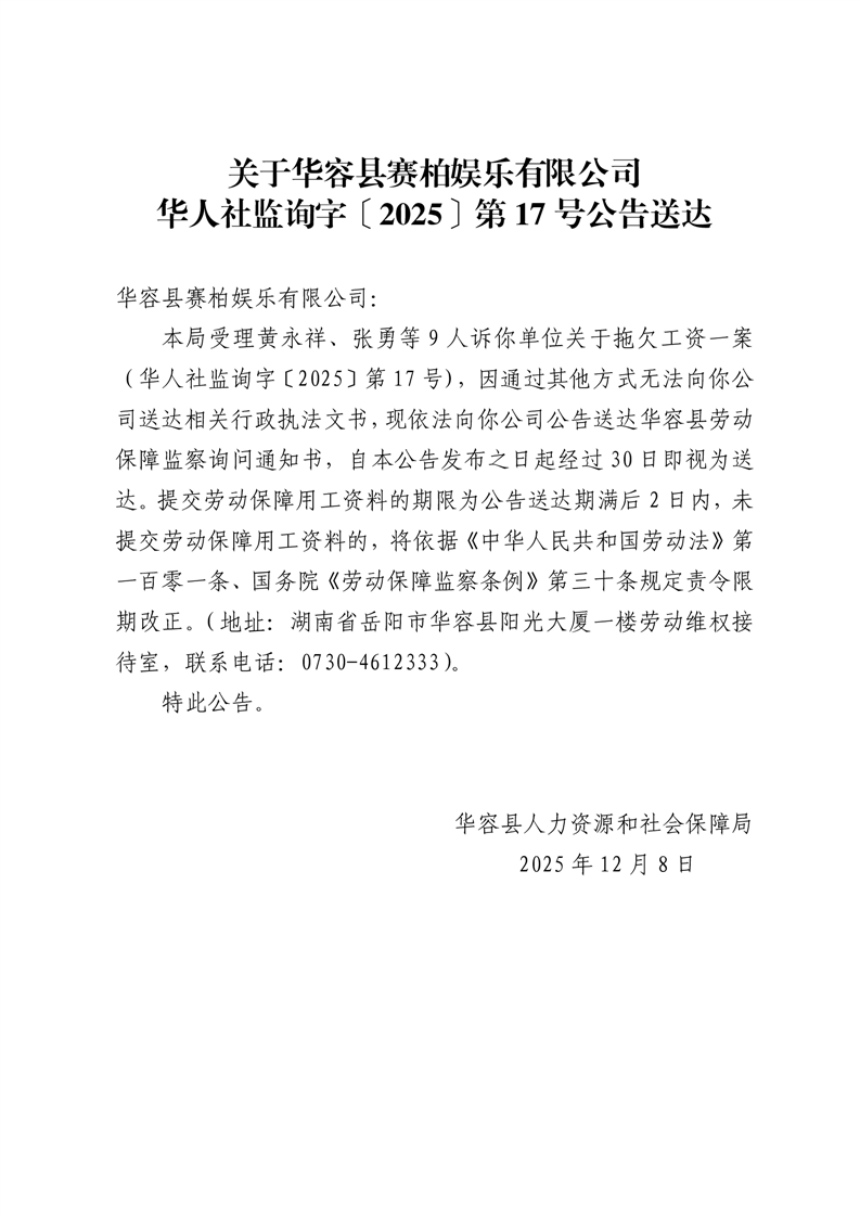 关于华容县赛柏娱乐有限公司华人社监询字〔2025〕第17号公告送达
