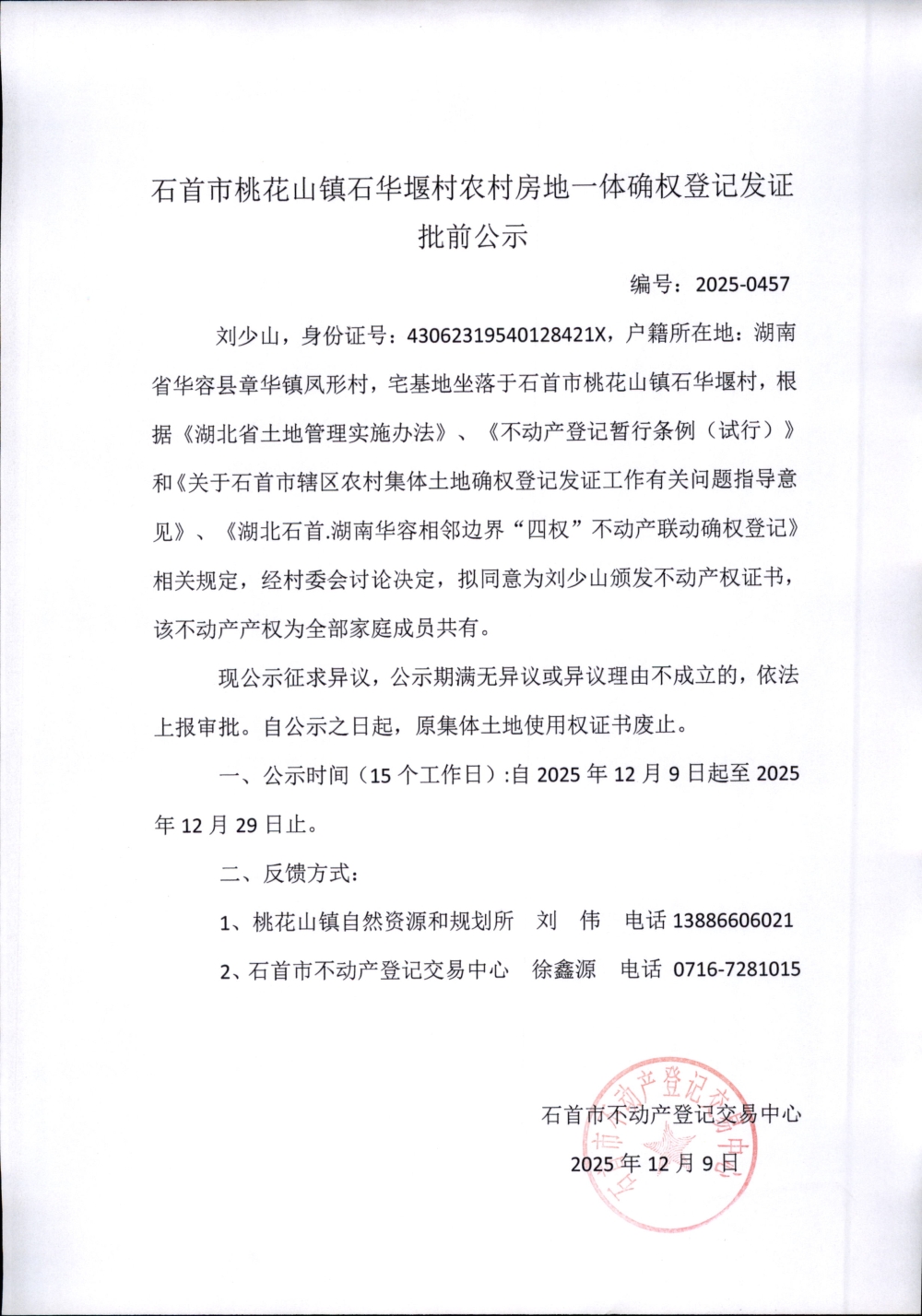石首市桃花山镇石华堰农村房地一体确权登记发证(刘少山)