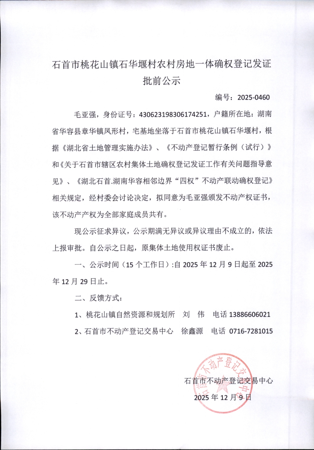 石首市桃花山镇石华堰农村房地一体确权登记发证(毛亚强)