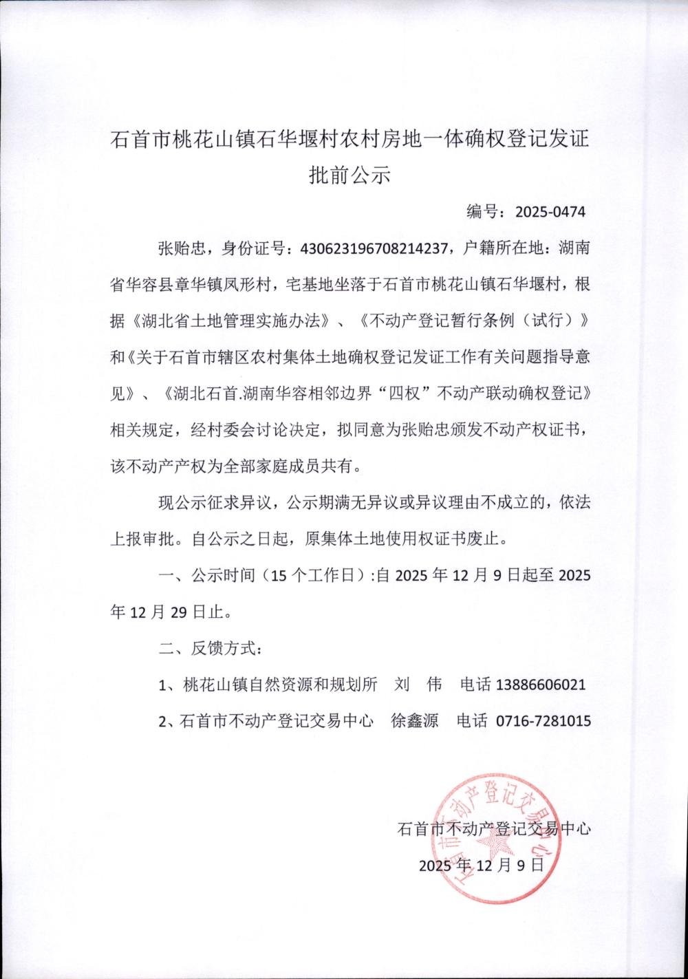 石首市桃花山镇石华堰农村房地一体确权登记发证(张贻忠)
