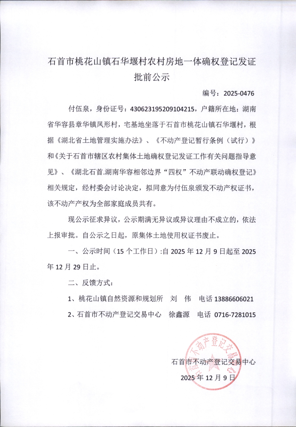 石首市桃花山镇石华堰农村房地一体确权登记发证(付伍泉)