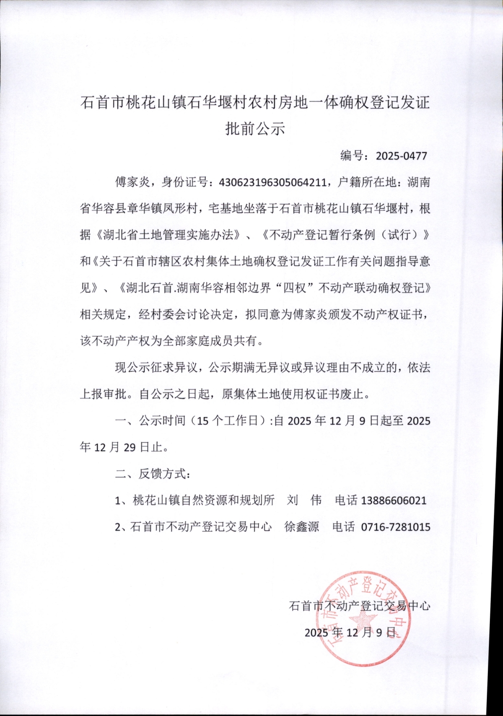 石首市桃花山镇石华堰农村房地一体确权登记发证(傅家炎)
