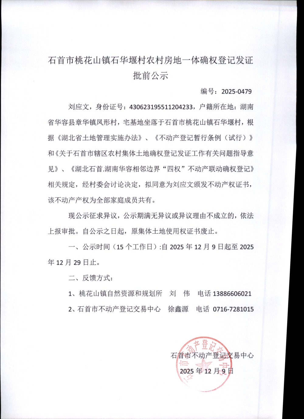 石首市桃花山镇石华堰农村房地一体确权登记发证(刘应文)