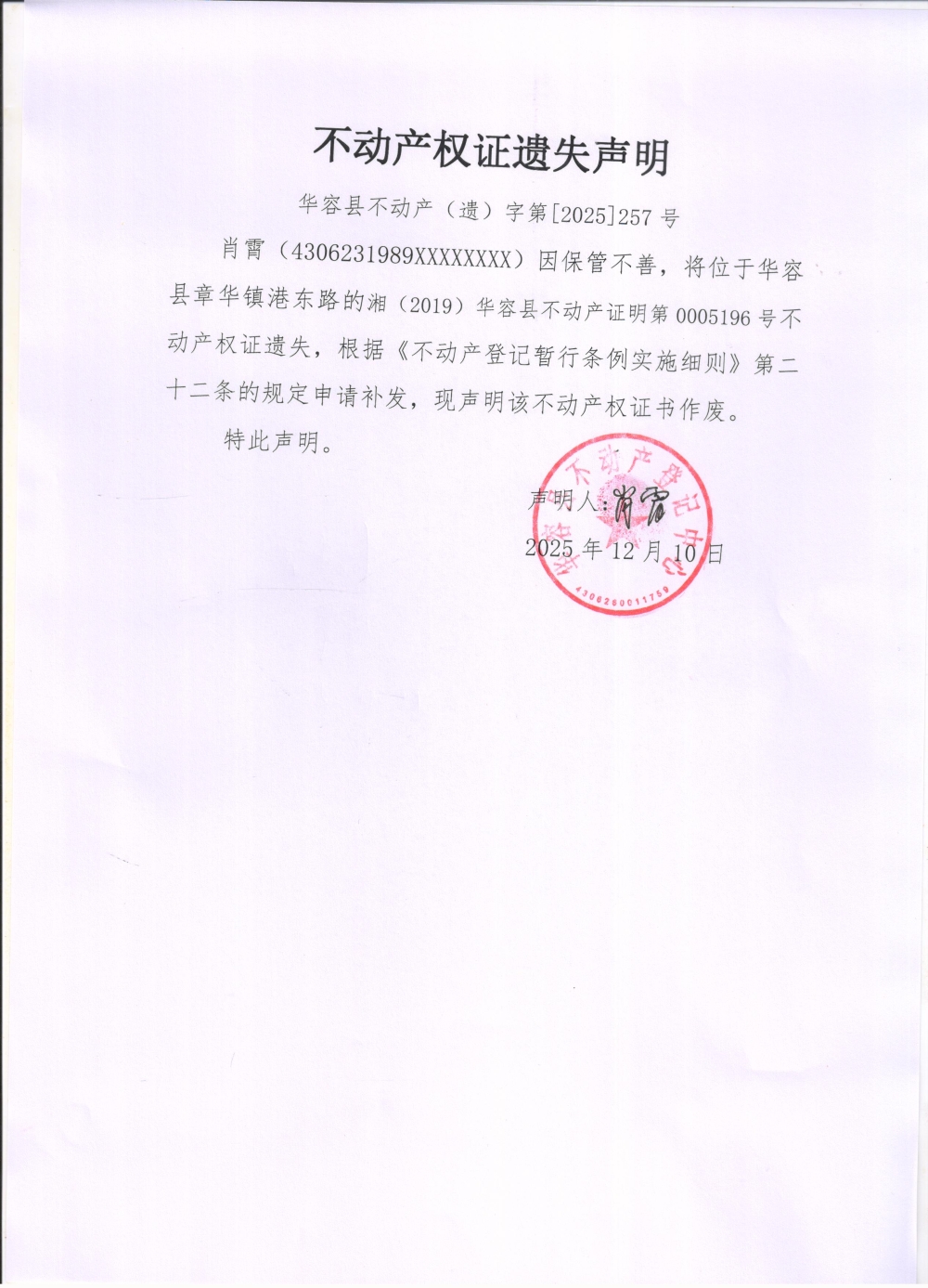 不动产权证遗失声明(肖霄)