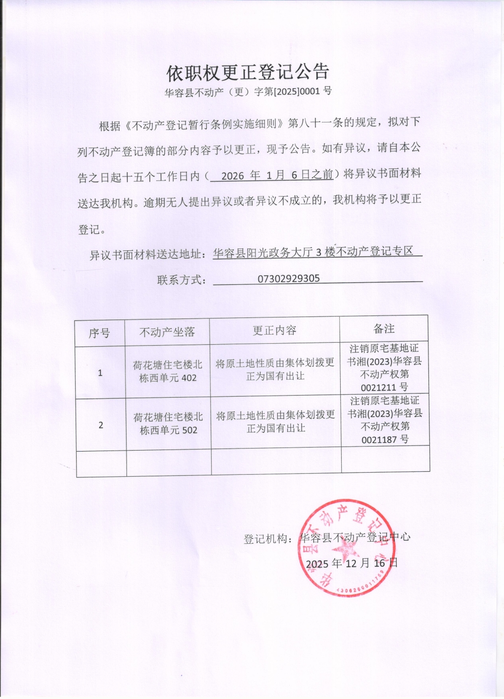 依职权更正登记公告