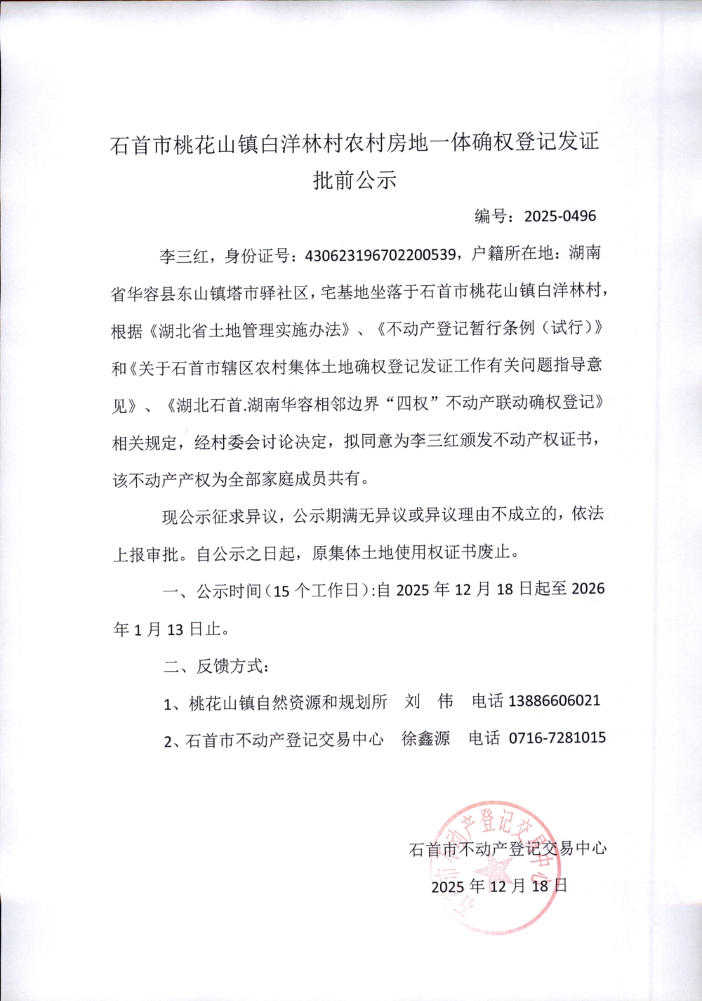 石首市桃花山镇白洋林村农村房地一体确权登记发证(李三红)
