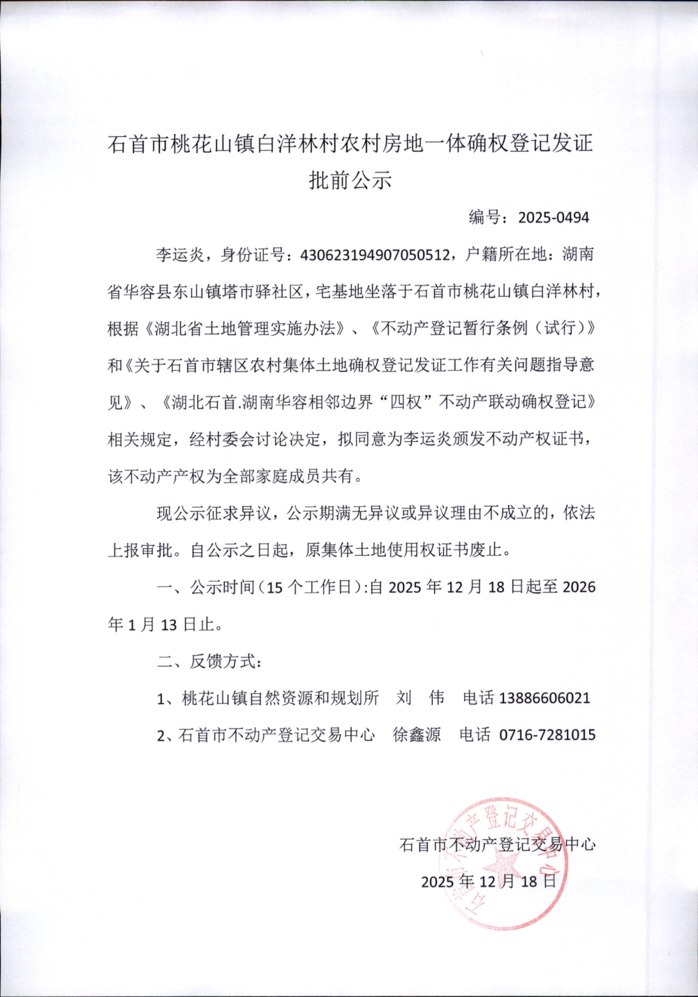 石首市桃花山镇白洋林村农村房地一体确权登记发证(李运炎)