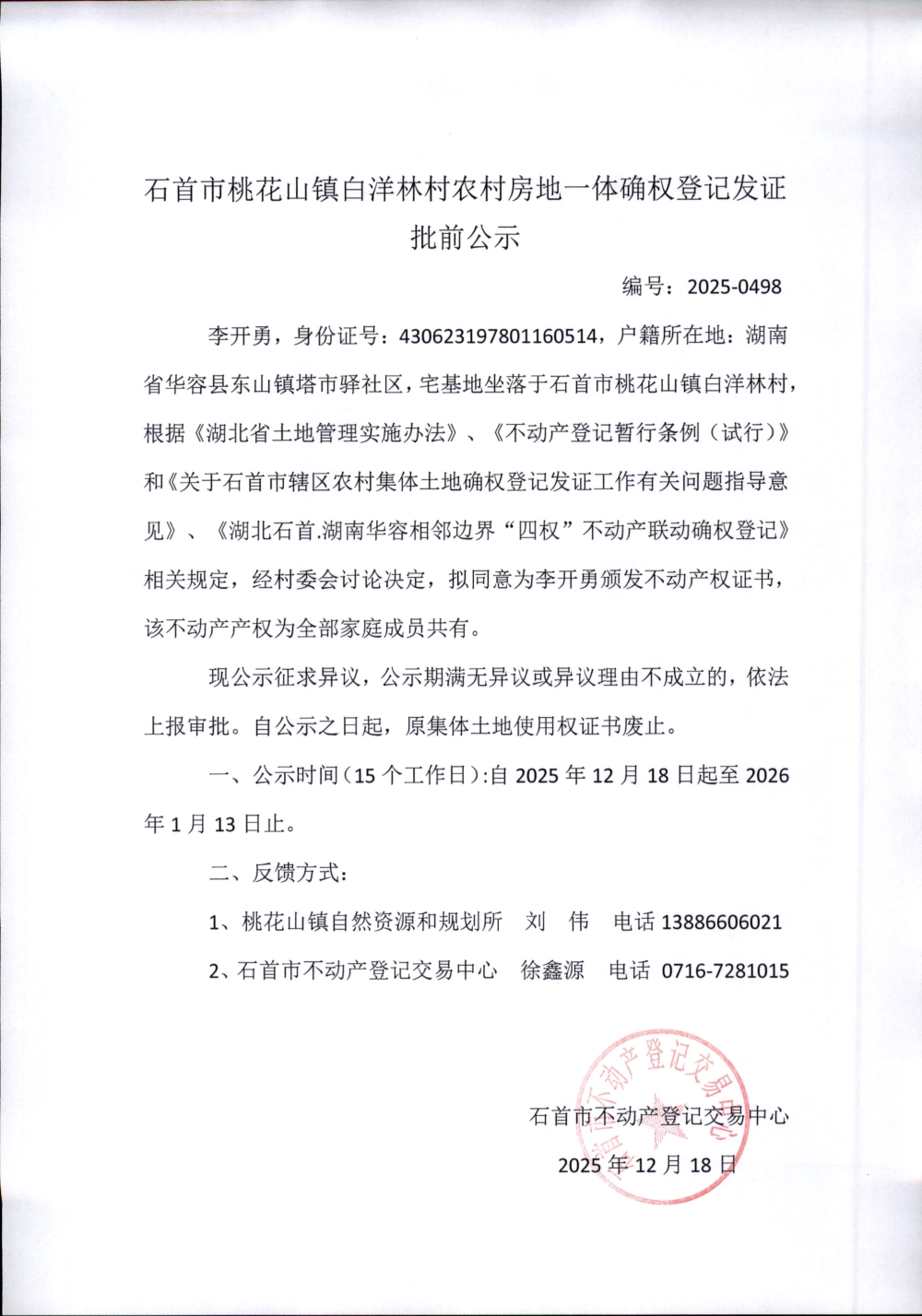 石首市桃花山镇白洋林村农村房地一体确权登记发证(李开勇)