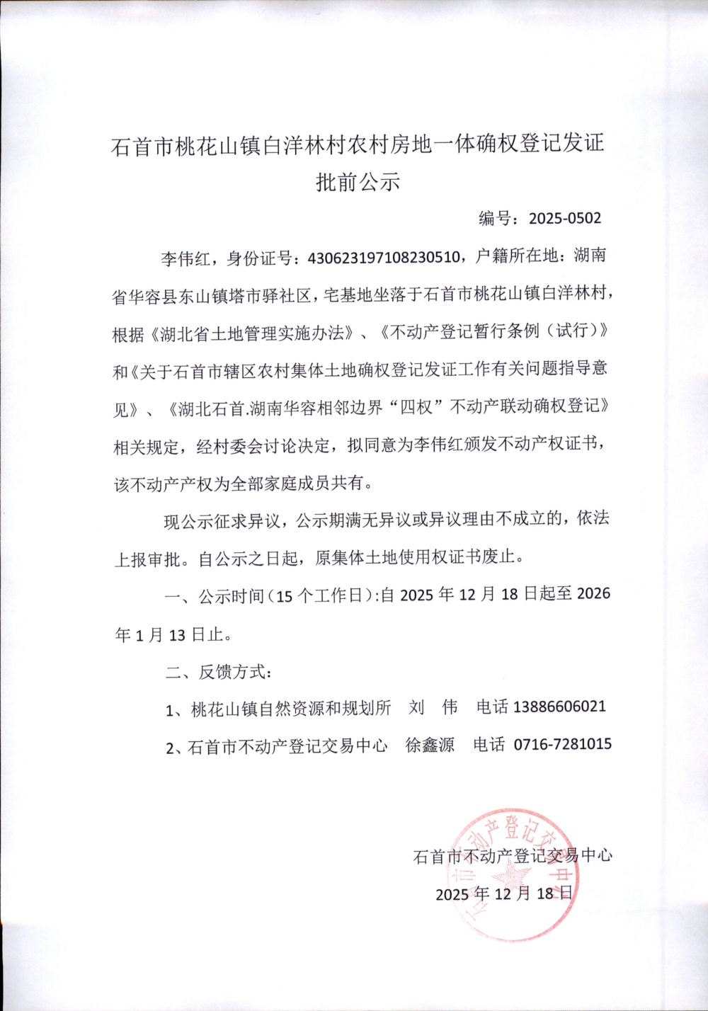 石首市桃花山镇白洋林村农村房地一体确权登记发证(李伟红)