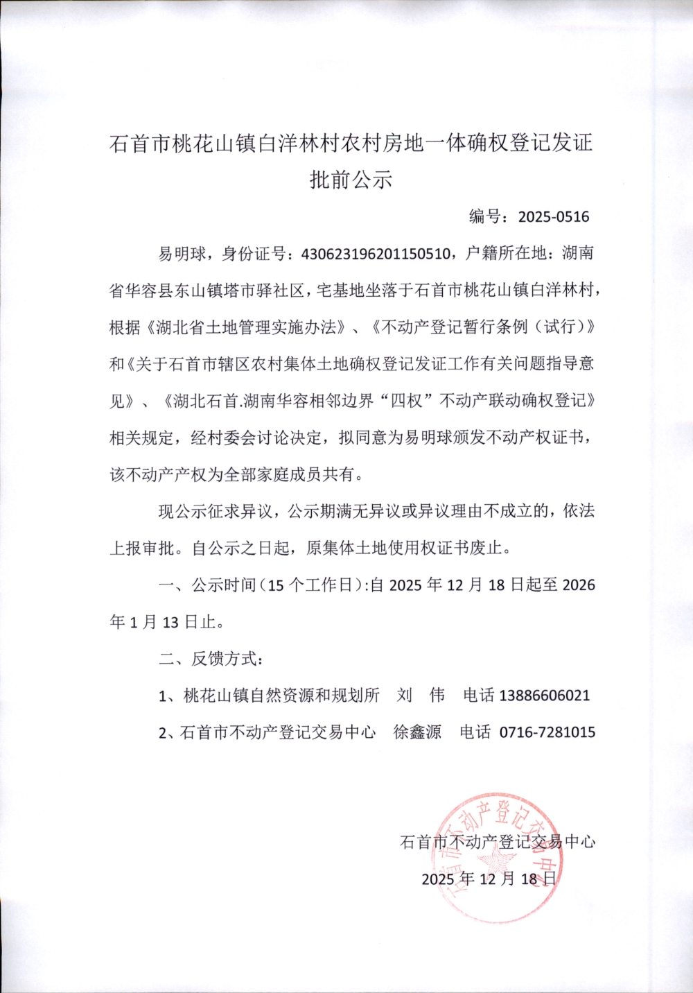 石首市桃花山镇白洋林村农村房地一体确权登记发证(易明球)