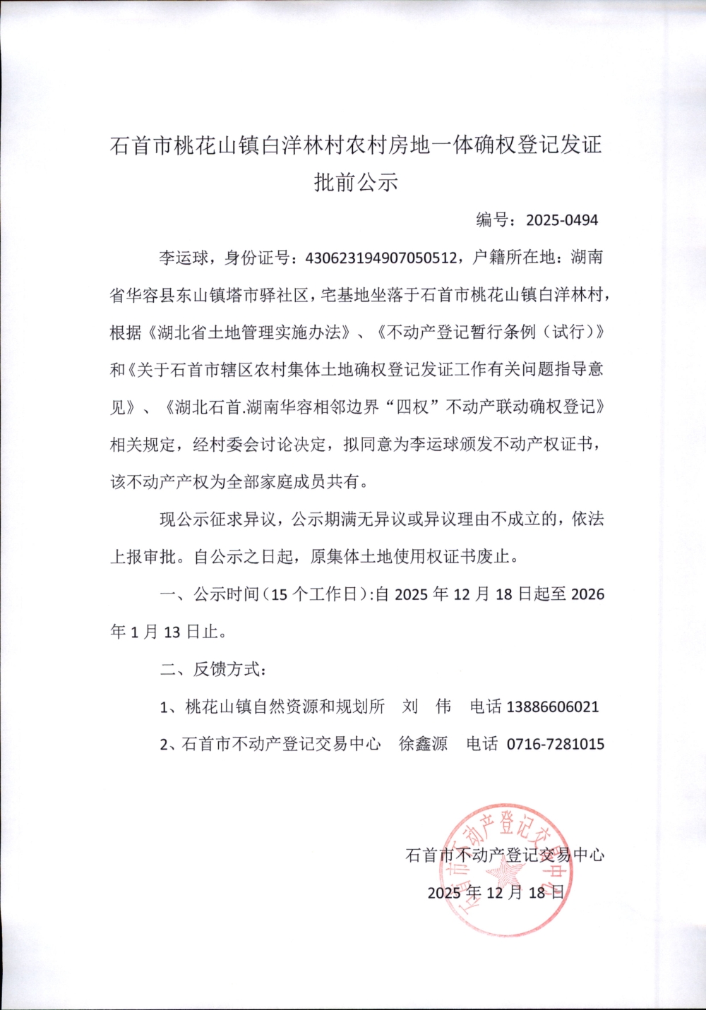 石首市桃花山镇白洋林村农村房地一体确权登记发证(李运球)