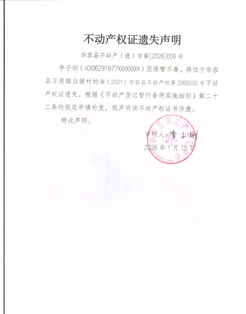 不动产权证遗失声明(李子刚)