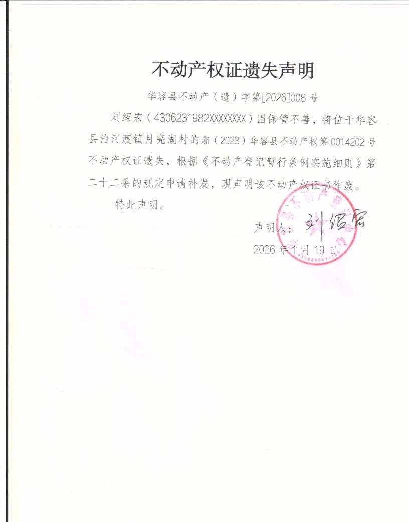 不动产权证遗失声明(刘绍宏)