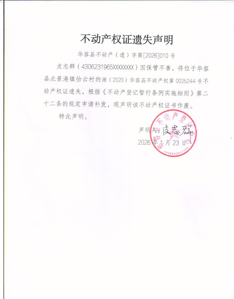 不动产权证遗失声明(皮志群)
