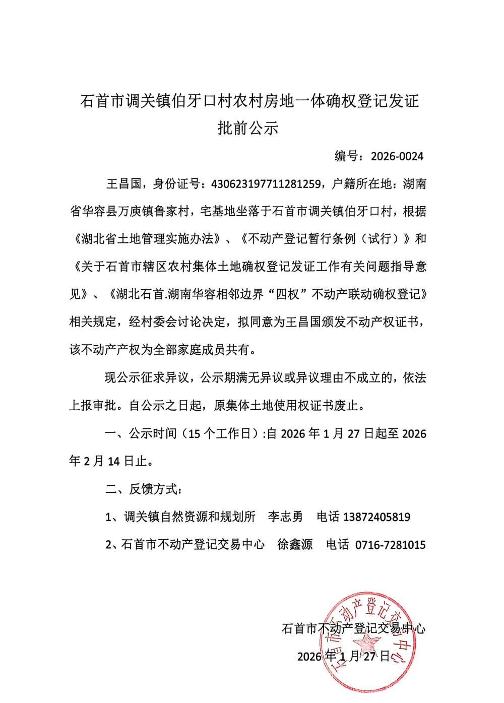 石首市调关镇伯牙口村农村房地一体确权登记发证批前公示(王昌国)