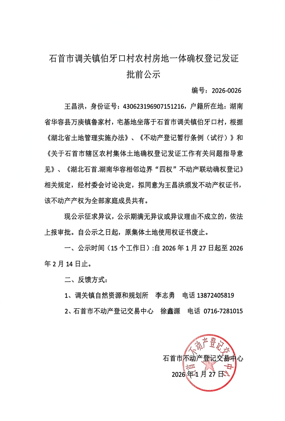 石首市调关镇伯牙口村农村房地一体确权登记发证批前公示(王昌洪)