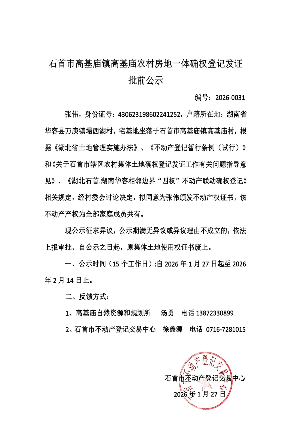 石首市高基庙镇高基庙农村房地一体确权登记发证批前公示(张伟)
