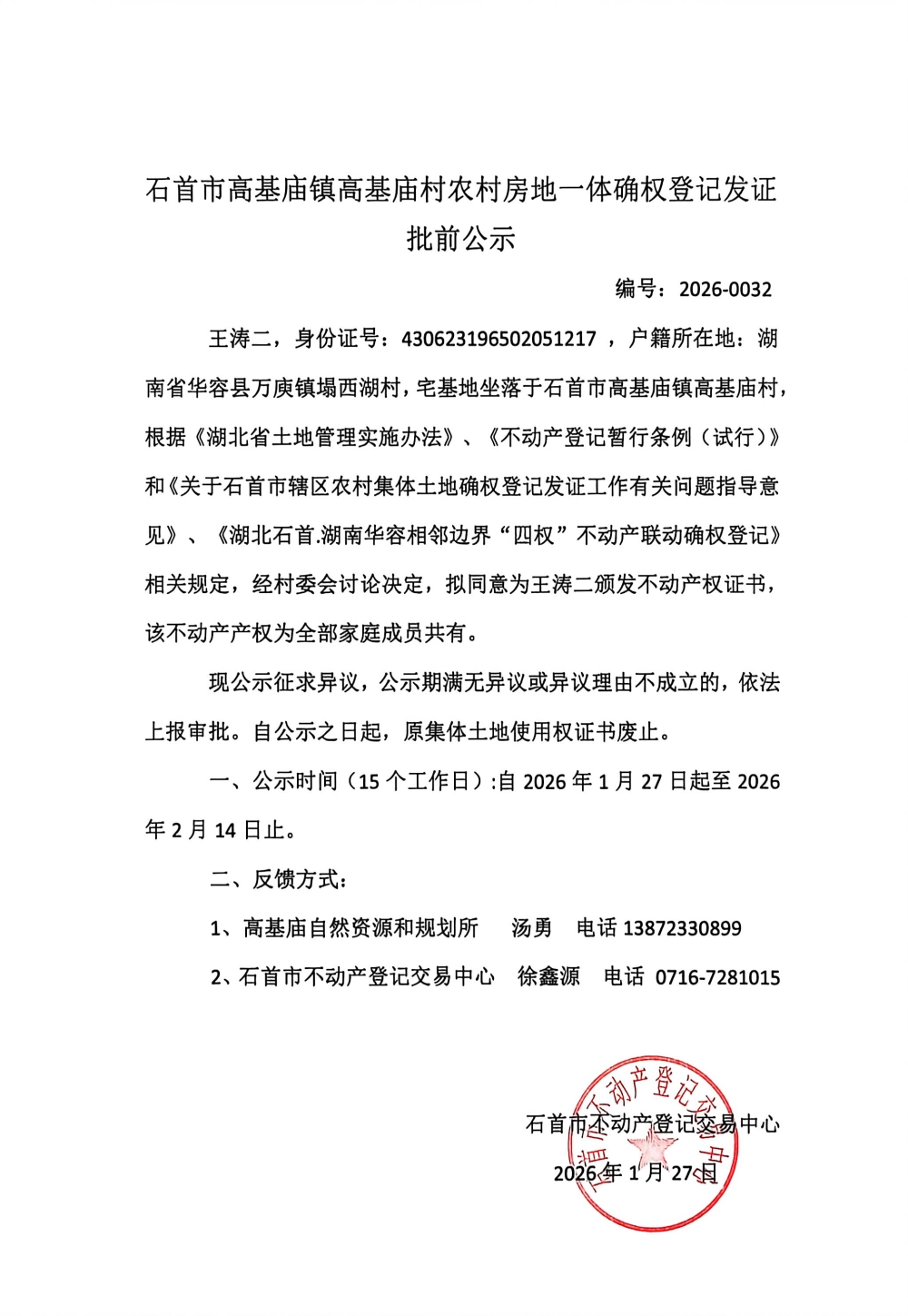 石首市高基庙镇高基庙村农村房地一体确权登记发证批前公示(王涛二)