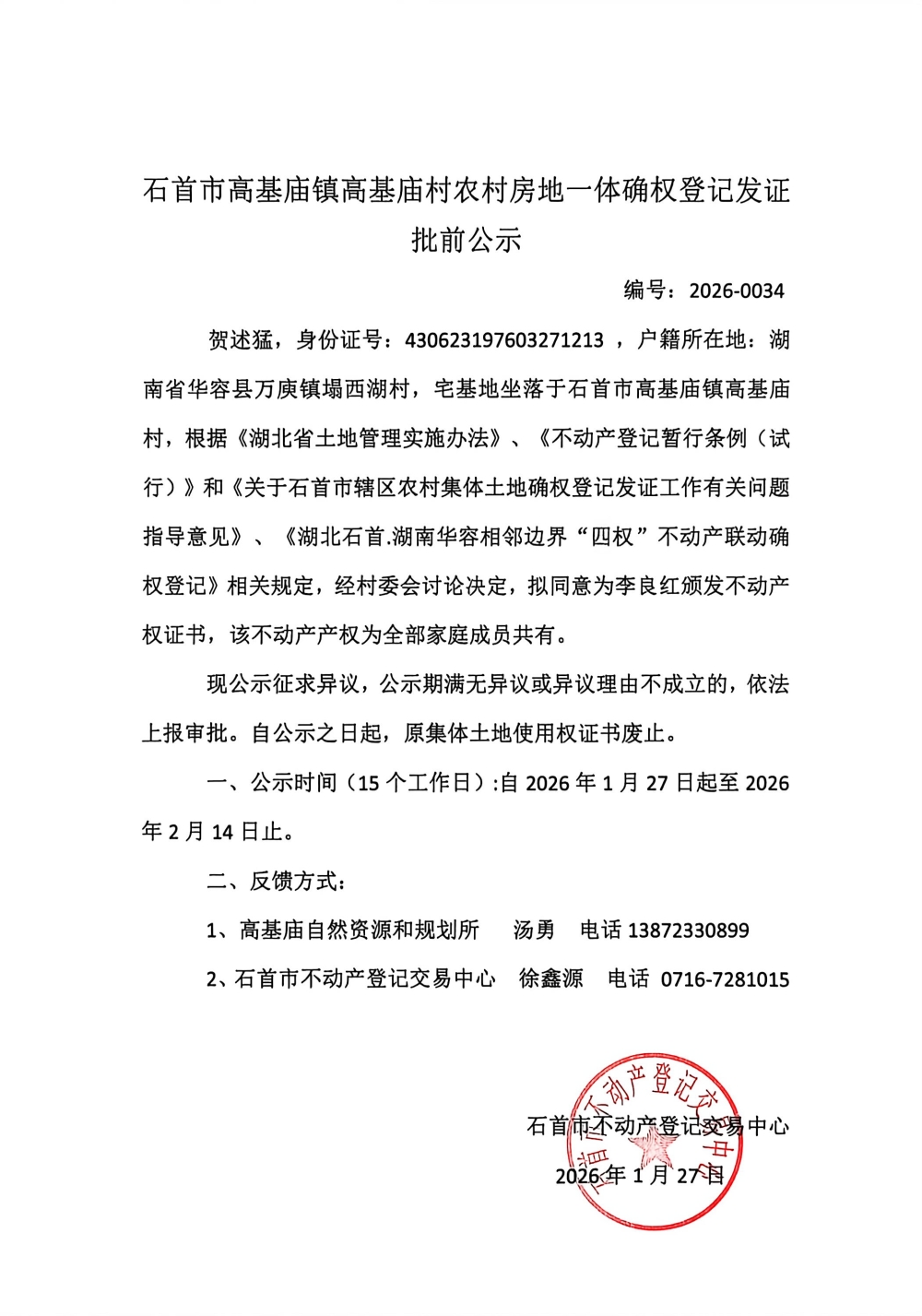 石首市高基庙镇高基庙村农村房地一体确权登记发证批前公示(贺述 猛)