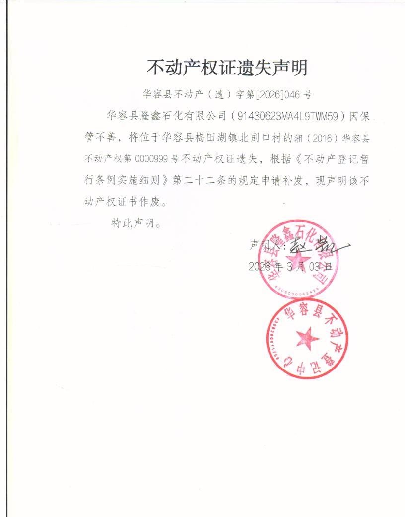 不动产权证遗失声明(隆鑫石化)