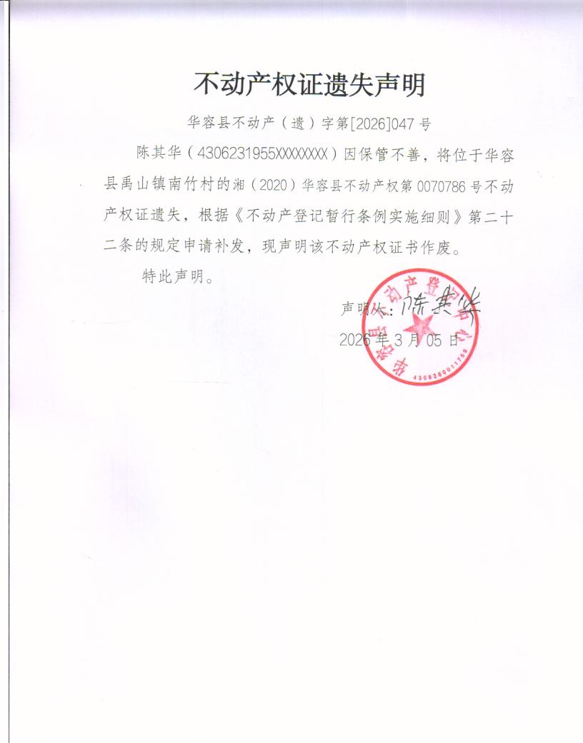 不动产权证遗失声明(陈其华)