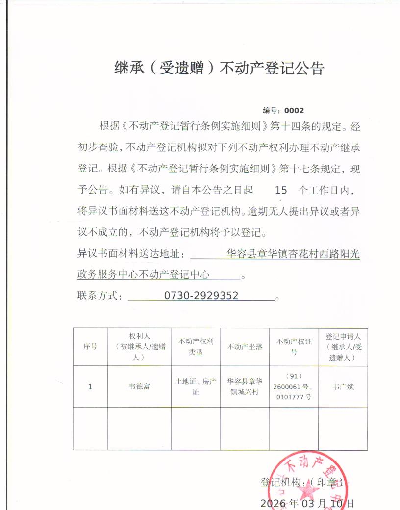 继承(受遗赠)不动产登记公告(韦德富转韦广斌)