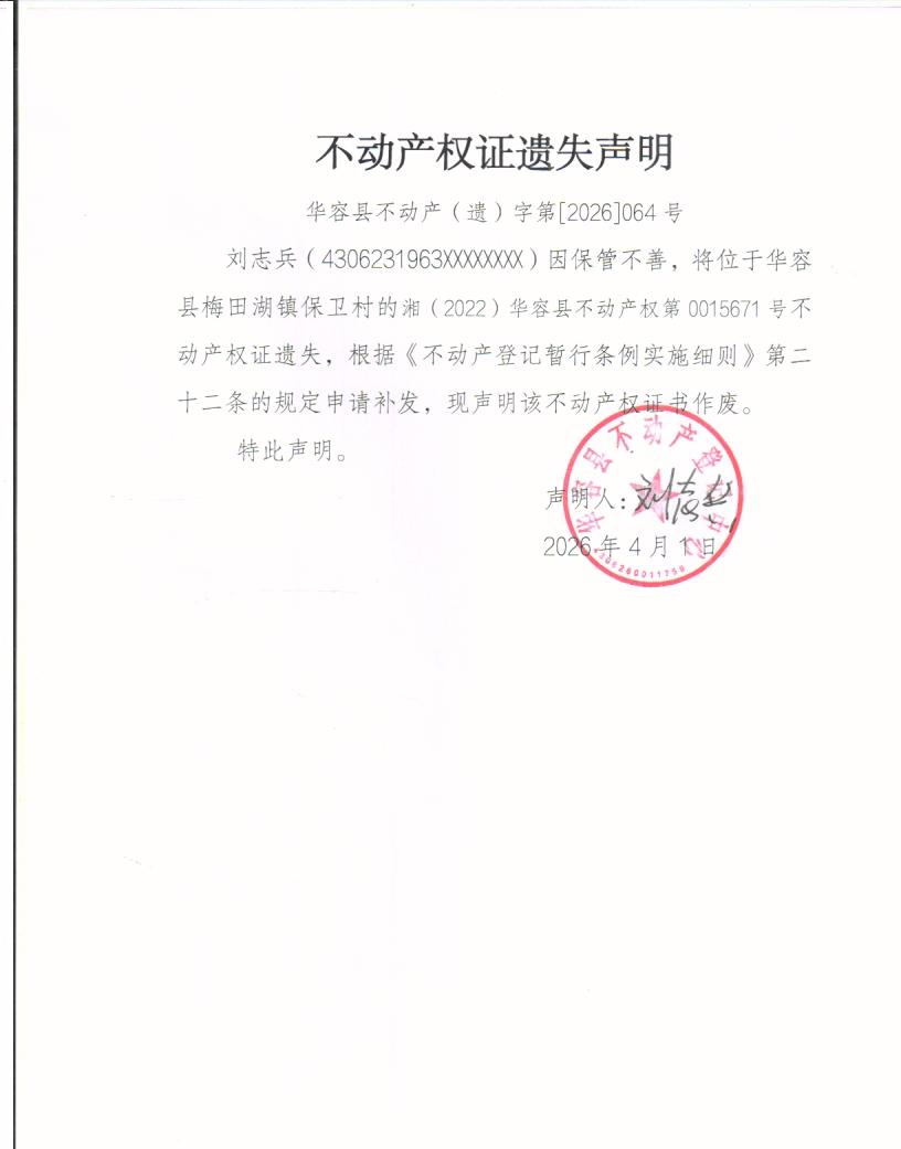 不动产权证遗失声明(刘志兵)