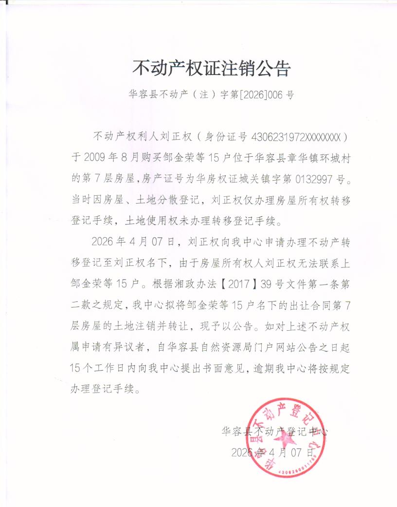 不动产权证注销公告(邹金荣转刘正权)