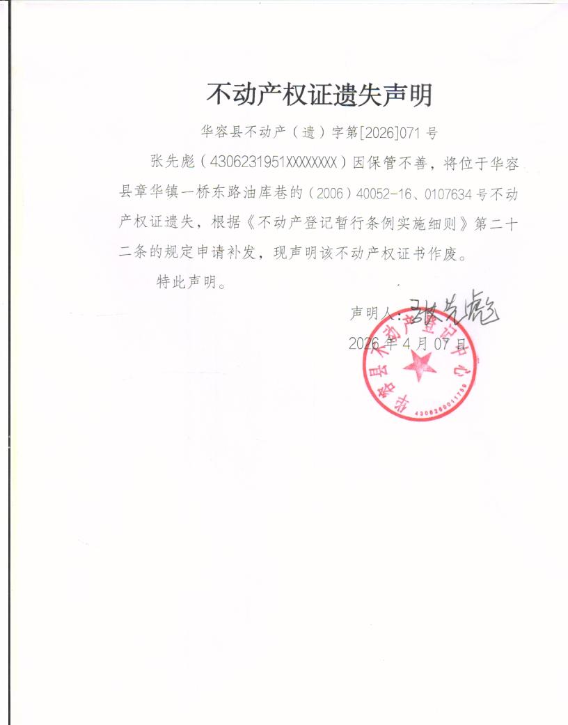 不动产权证遗失声明(张先彪)