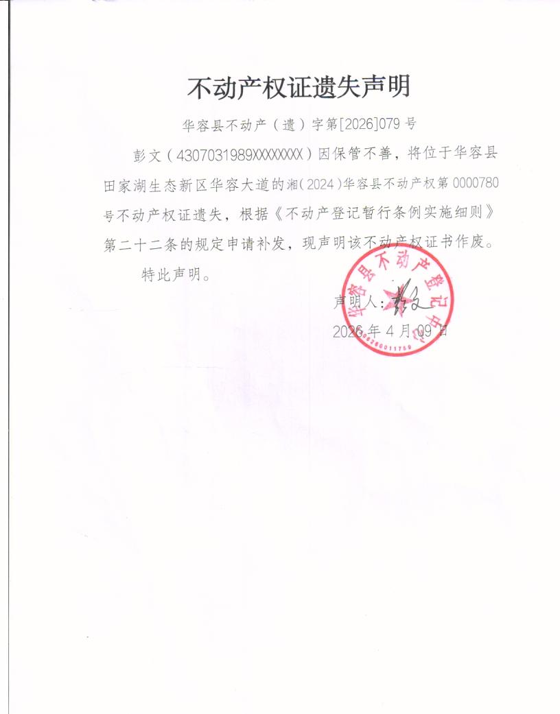 不动产权证遗失声明(彭文)