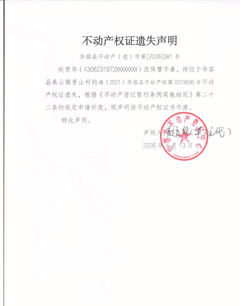 不动产权证遗失声明(赵育华)