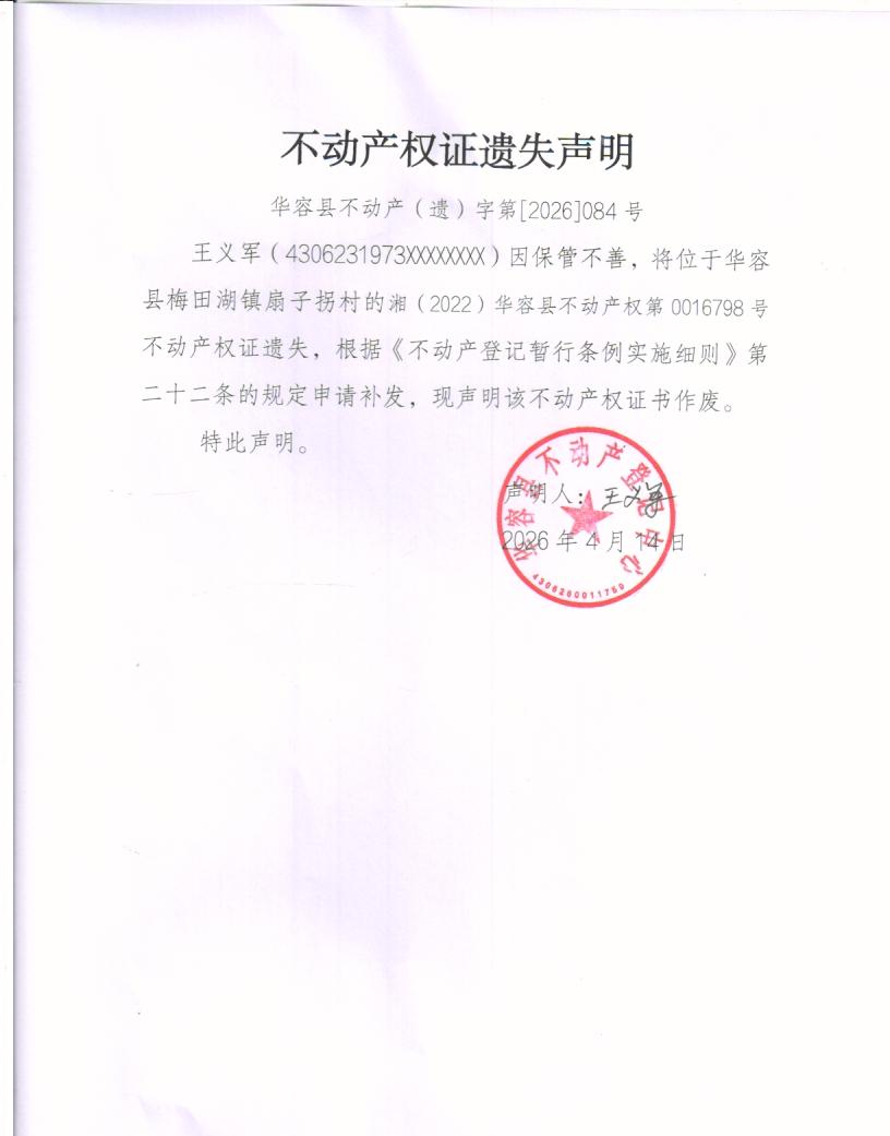 不动产权证遗失声明(王义军)
