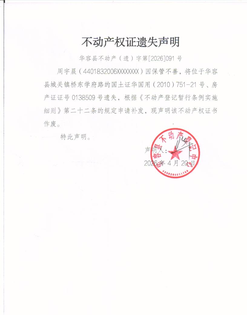 不动产权证遗失声明(周宇晨)