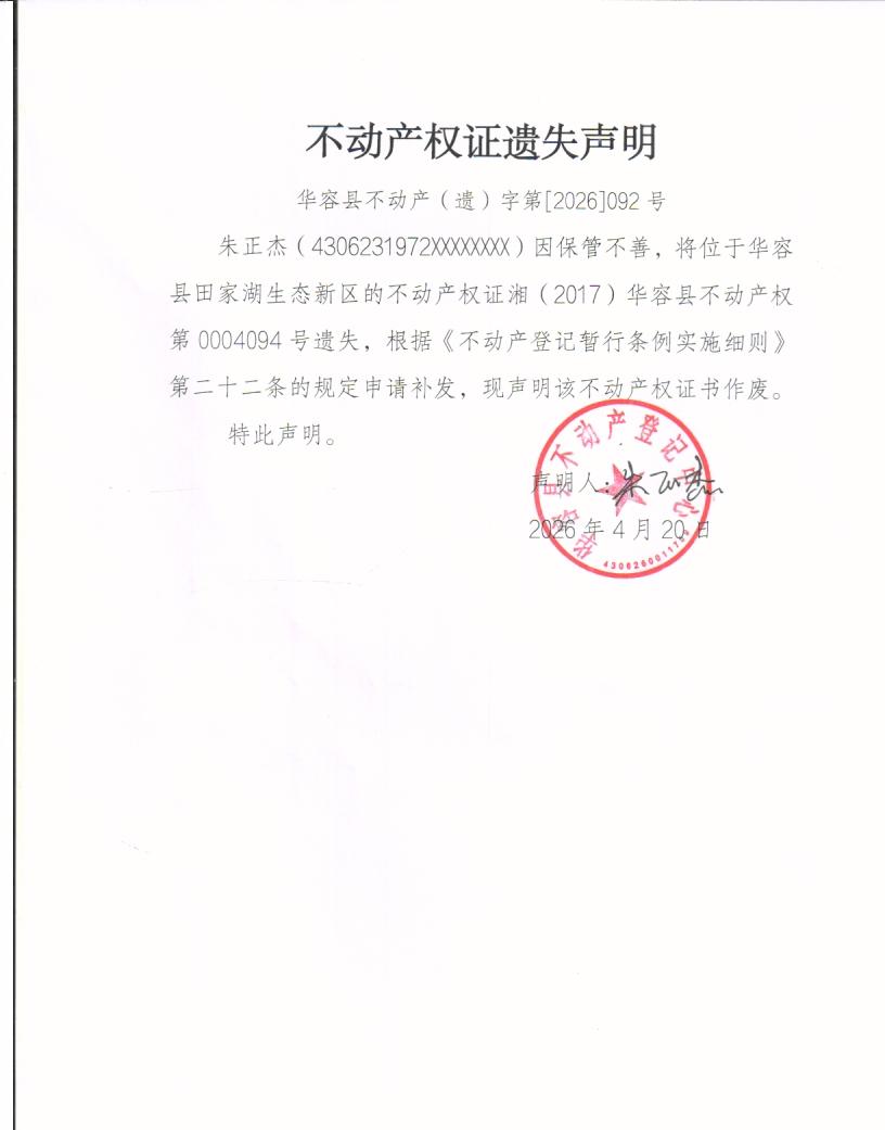 不动产权证遗失声明(朱正杰)