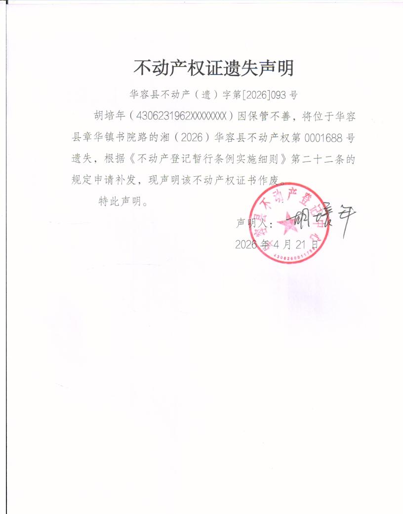 不动产权证遗失声明(胡培年)