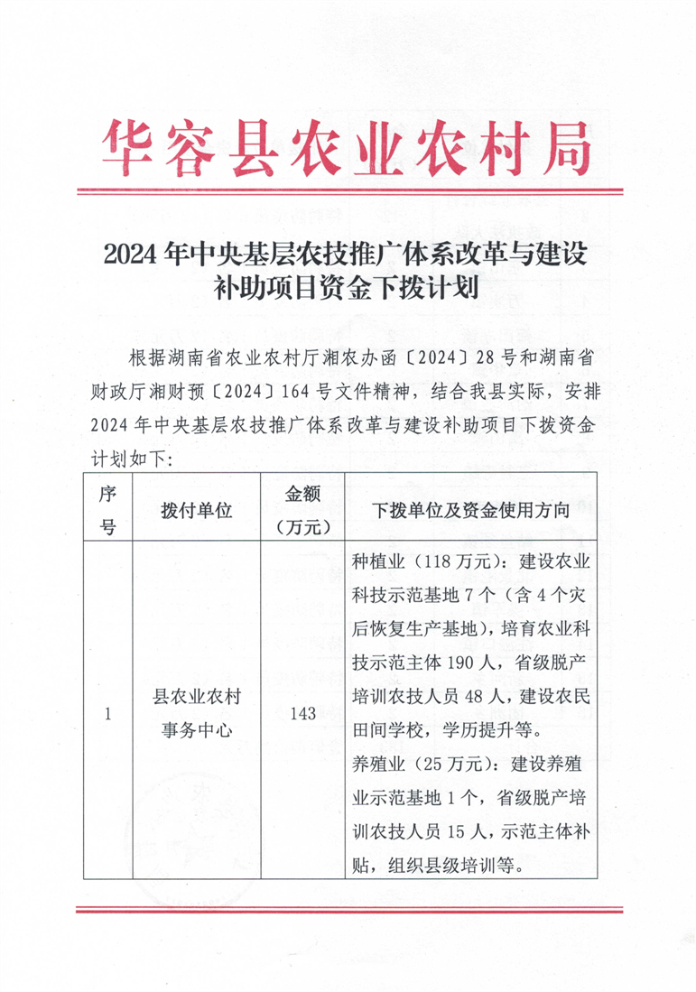 2024年中央基层农技推广体系改革与建设补助项目资金下拨计划