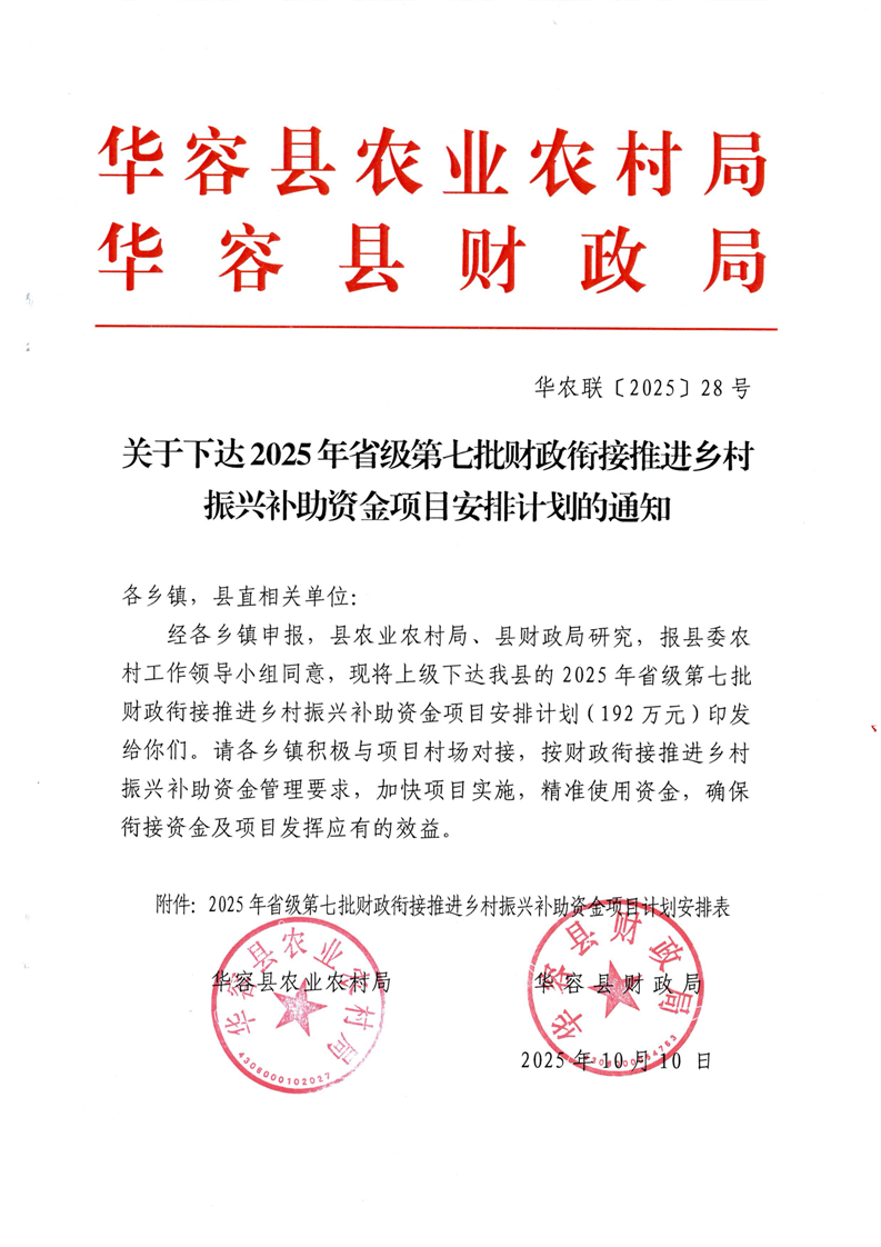 华农联(2025)28号-关于下达2025年省级第七批财政衔接推进乡村振兴补助资金项目安排计划的通知-192W
